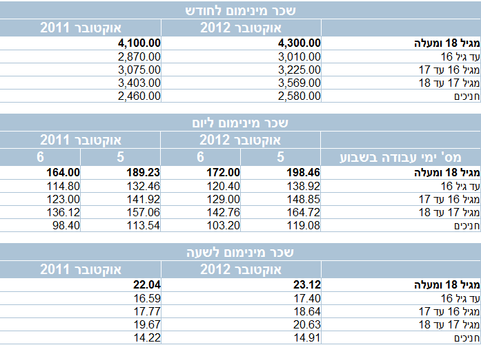 "שכר מינימום לשעה" – החלק ה- 186 של שכר המינימום (לנוער עובד: החלק ה- 173 של שכר המינימום החודשי לנוער).